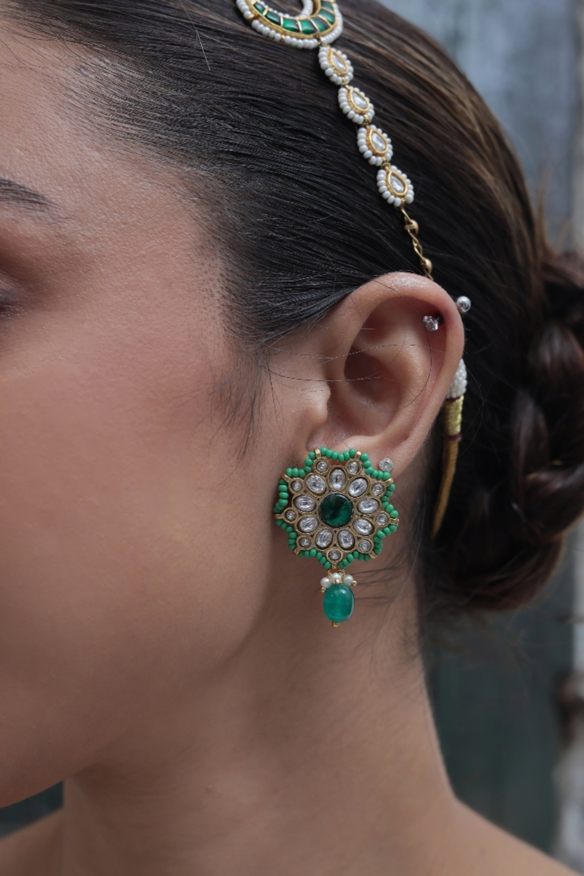These exquisite Jadau Earrings are a tribute to timeless elegance, crafted with intricate floral detailing inspired by the grace of a blooming lotus. Plated in pure gold, each piece reflects regal charm while offering modern durability. Designed to be anti-allergic and finished with an anti-tarnish coating, these earrings promise lasting brilliance without turning black. Adorned with delicate pearls and sparkling stones, they beautifully blend traditional artistry with contemporary sensibilities. Whether it's a wedding, festive celebration, or a touch of everyday luxury, this pair is the perfect companion to elevate your ensemble.