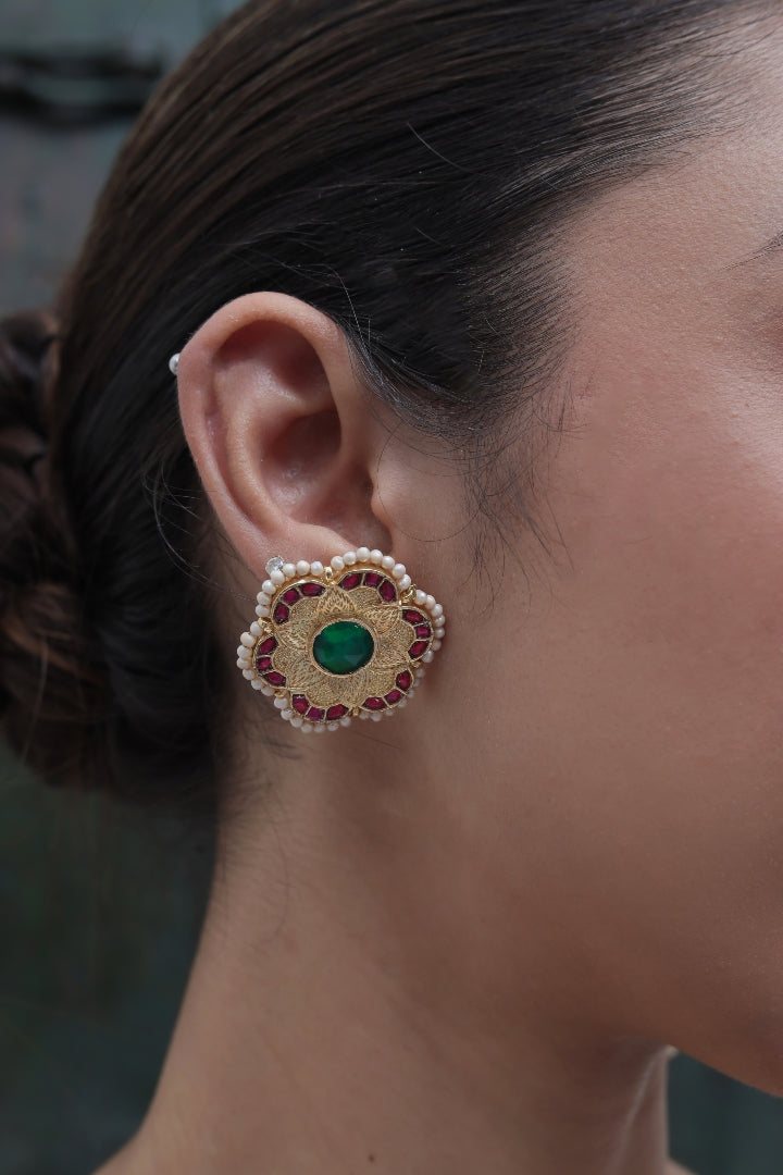 These exquisite Jadau Earrings are crafted with intricate floral detailing, inspired by the elegance of a blooming lotus.Made in pure gold plating, they are anti-allergic and designed