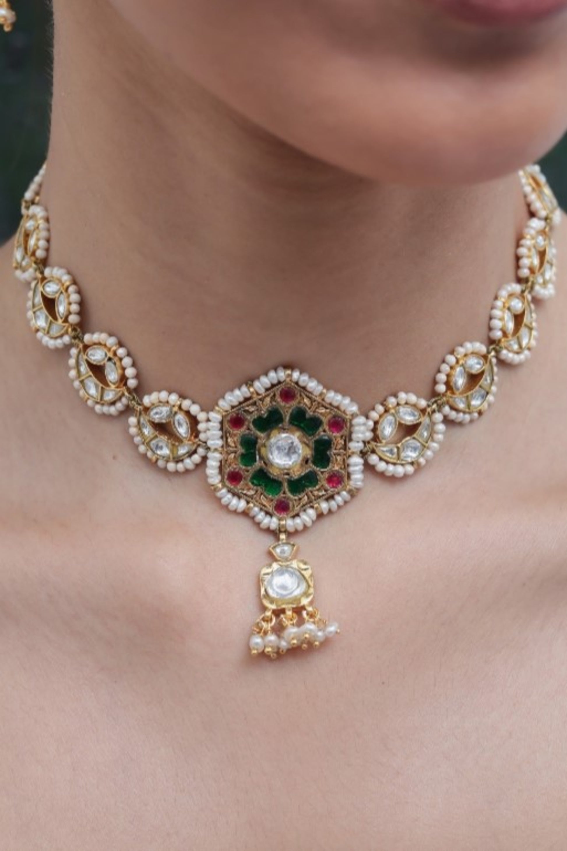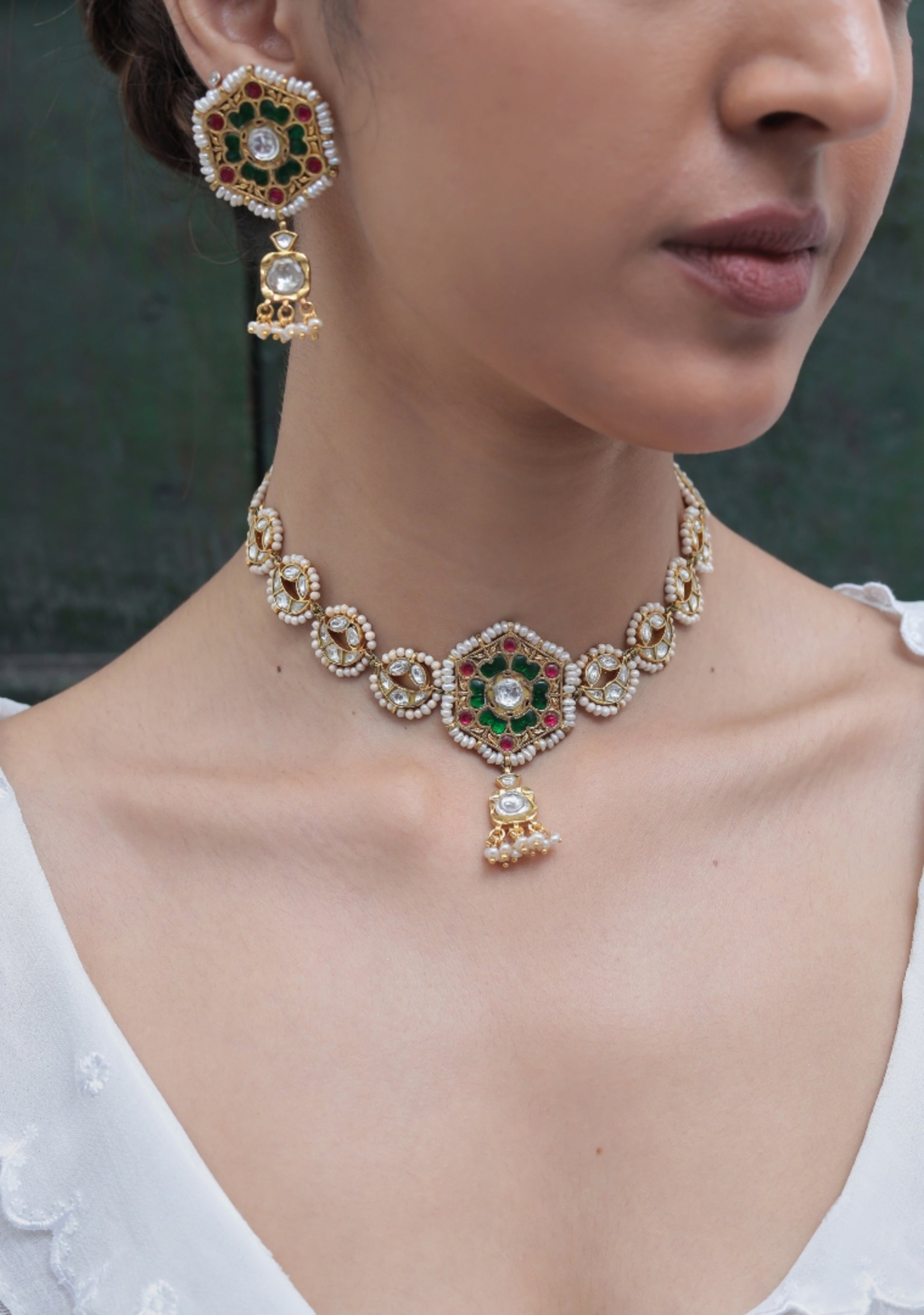 This regal Jadau necklace set with matching earrings showcases intricate craftsmanship with kundan work, meenakari detailing, and pearl embellishments. The hexagonal floral motifs add a royal touch, making it a statement accessory for grand occasions. Finished in pure gold plating, the set is anti-allergic, anti-tarnish, and designed to never go black, ensuring everlasting radiance.