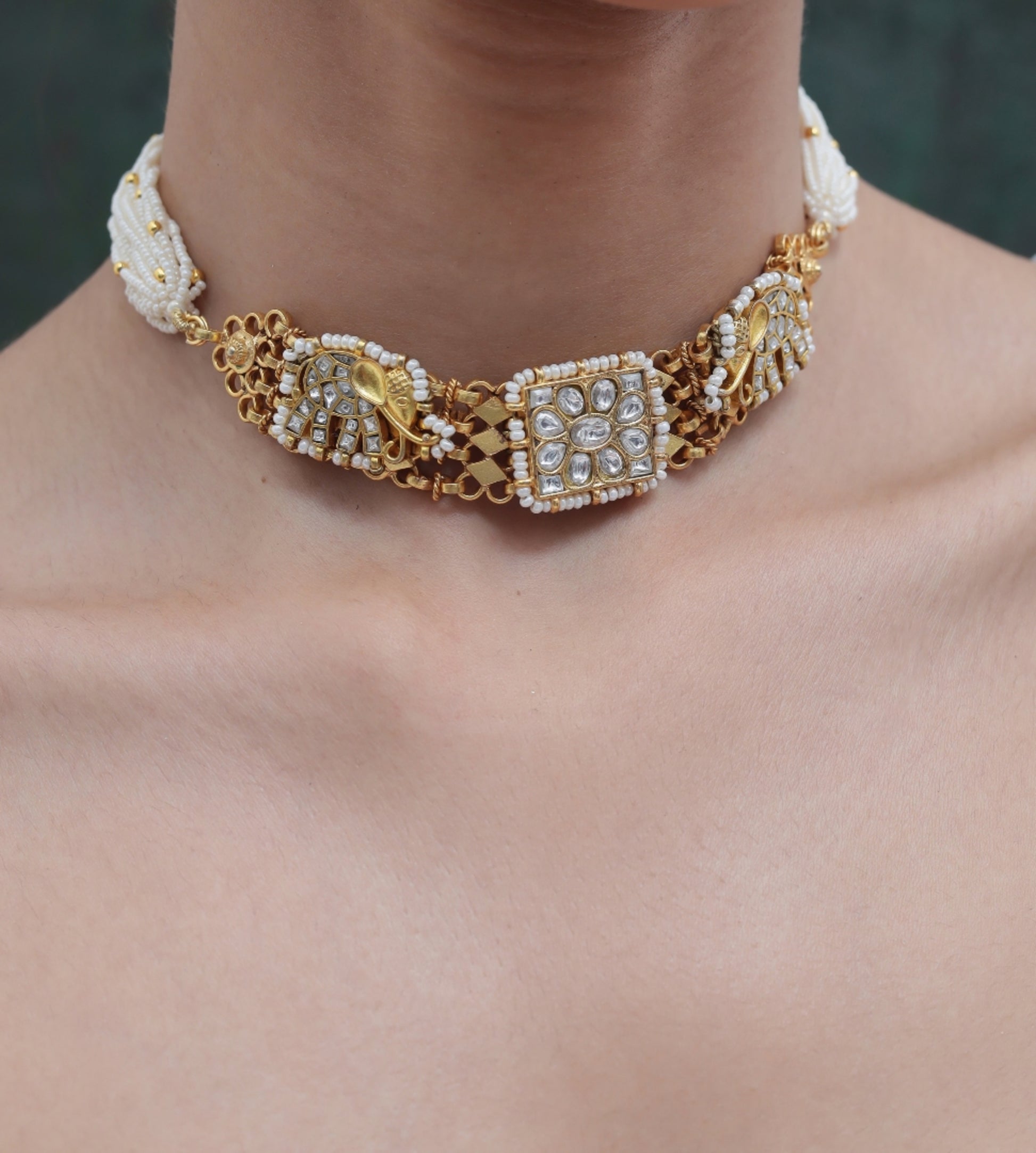 This regal Jadau necklace set with matching earrings showcases intricate craftsmanship with kundan work, meenakari detailing, and pearl embellishments. The hexagonal floral motifs add a royal touch, making it a statement accessory for grand occasions. Finished in pure gold plating, the set is anti-allergic, anti-tarnish, and designed to never go black, ensuring everlasting radiance.