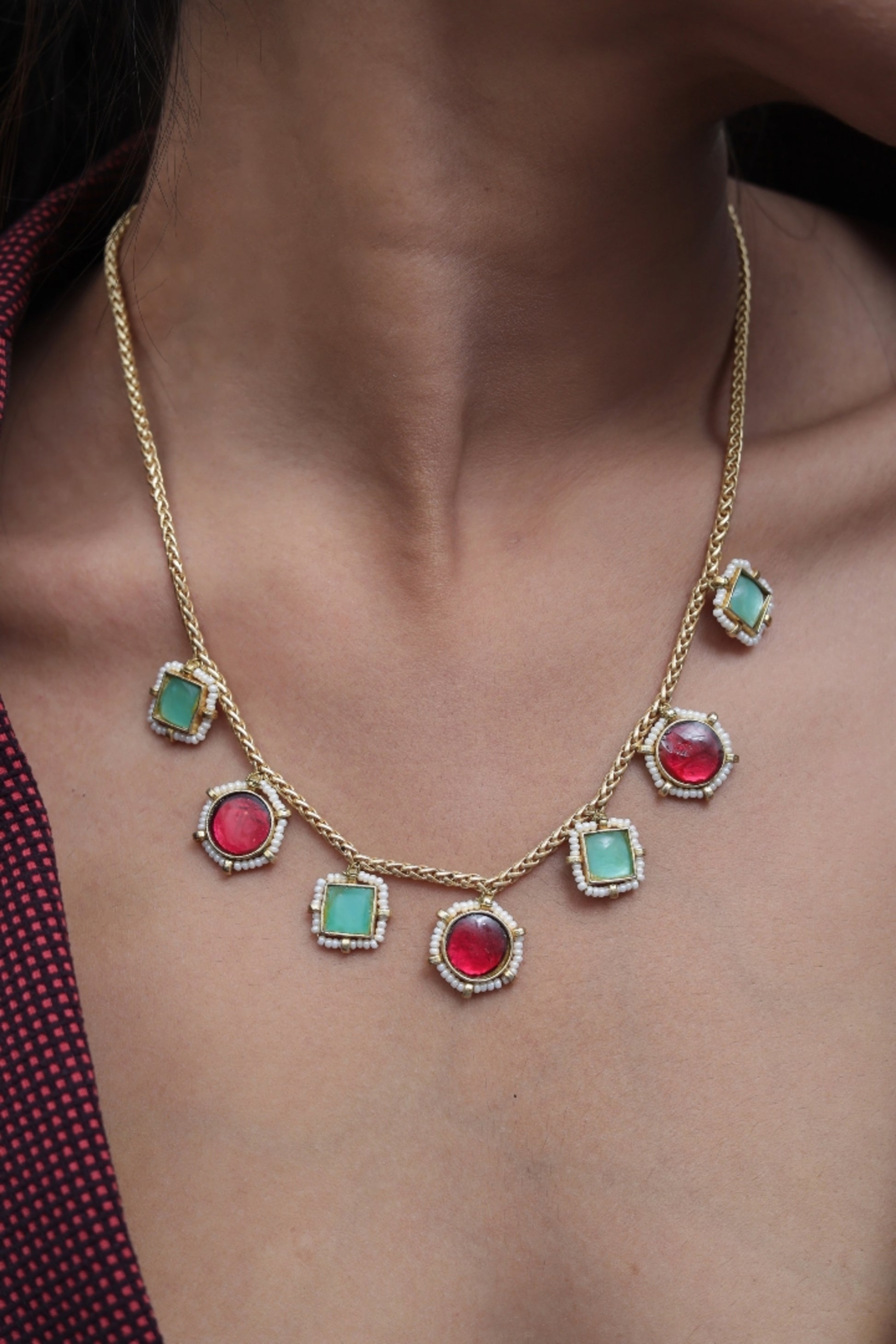 This regal Jadau necklace set with matching earrings showcases intricate craftsmanship with kundan work, meenakari detailing, and pearl embellishments. The hexagonal floral motifs add a royal touch, making it a statement accessory for grand occasions. Finished in pure gold plating, the set is anti-allergic, anti-tarnish, and designed to never go black, ensuring everlasting radiance.