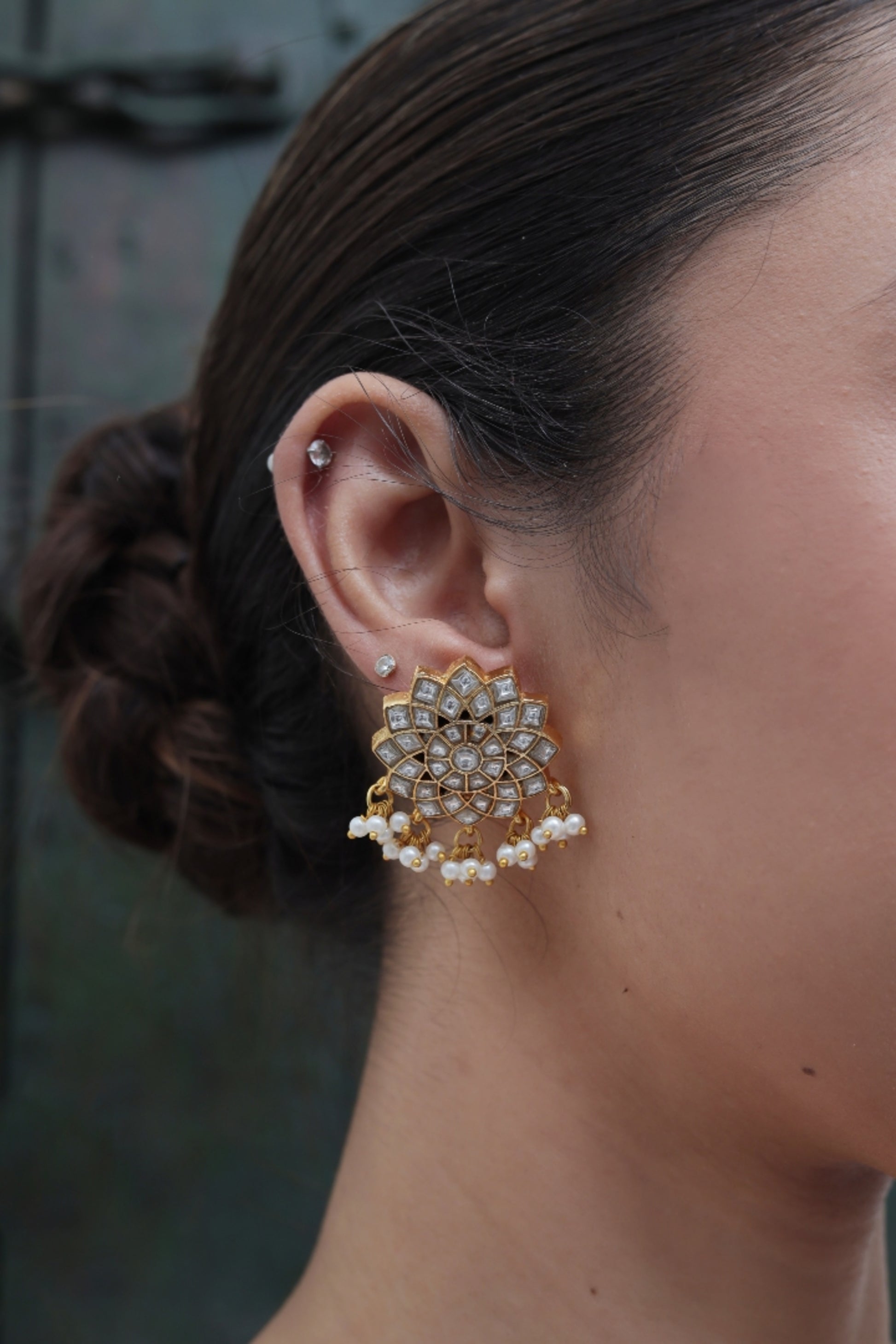 These exquisite Jadau Earrings are crafted with intricate floral detailing, inspired by the elegance of a blooming lotus. Made in pure gold plating, they are anti-allergic and designed with an anti-tarnish finish that ensures they never turn black. Adorned with delicate pearls and sparkling stones, this pair combines traditional craftsmanship with modern durability—perfect for weddings, festive occasions, or timeless everyday elegance.