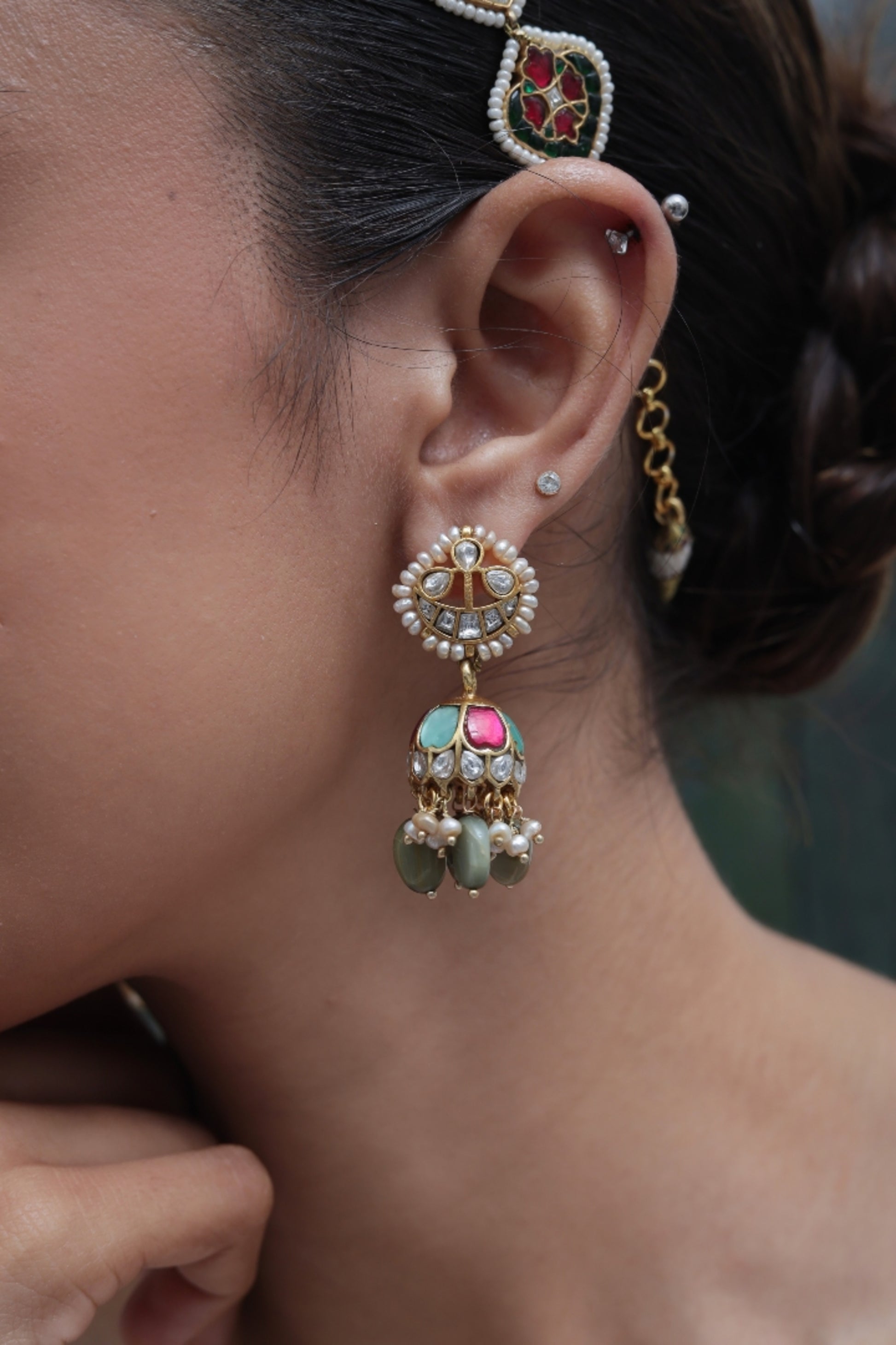 These exquisite Jadau Earrings are a tribute to timeless elegance, crafted with intricate floral detailing inspired by the grace of a blooming lotus. Plated in pure gold, each piece reflects regal charm while offering modern durability. Designed to be anti-allergic and finished with an anti-tarnish coating, these earrings promise lasting brilliance without turning black. Adorned with delicate pearls and sparkling stones, they beautifully blend traditional artistry with contemporary sensibilities. Whether it's a wedding, festive celebration, or a touch of everyday luxury, this pair is the perfect companion to elevate your ensemble.
