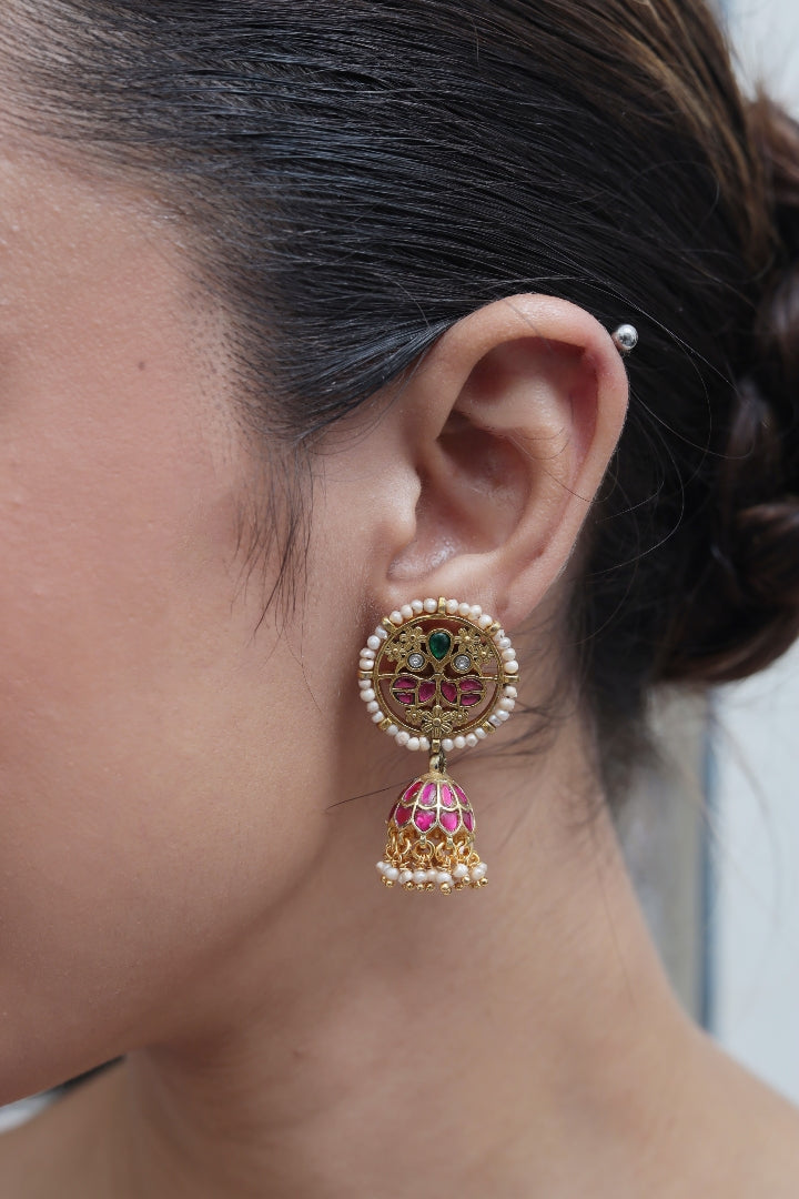 Turn heads with the timeless elegance of our Rajmohini Jadau Jhumka – a true celebration of royal craftsmanship and traditional charm. Handcrafted with intricate detail, this stunning piece features a pure gold-plated finish, embedded with delicate kundan work, and bordered with lustrous mini pearls. The pink meenakari dome adds a vibrant pop of heritage color, completing the regal look. Gentle on sensitive skin, Long-lasting shine, Stays beautiful, wear after wear, Perfect for weddings, festivals, or any occasion where you want to stand out with grace.