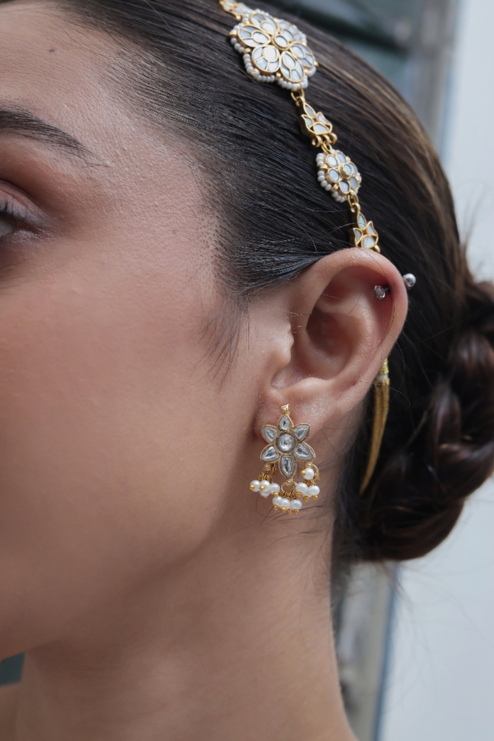 These exquisite Jadau Earrings are a tribute to timeless elegance, crafted with intricate floral detailing inspired by the grace of a blooming lotus. Plated in pure gold, each piece reflects regal charm while offering modern durability. Designed to be anti-allergic and finished with an anti-tarnish coating, these earrings promise lasting brilliance without turning black. Adorned with delicate pearls and sparkling stones, they beautifully blend traditional artistry with contemporary sensibilities. Whether it's a wedding, festive celebration, or a touch of everyday luxury, this pair is the perfect companion to elevate your ensemble.