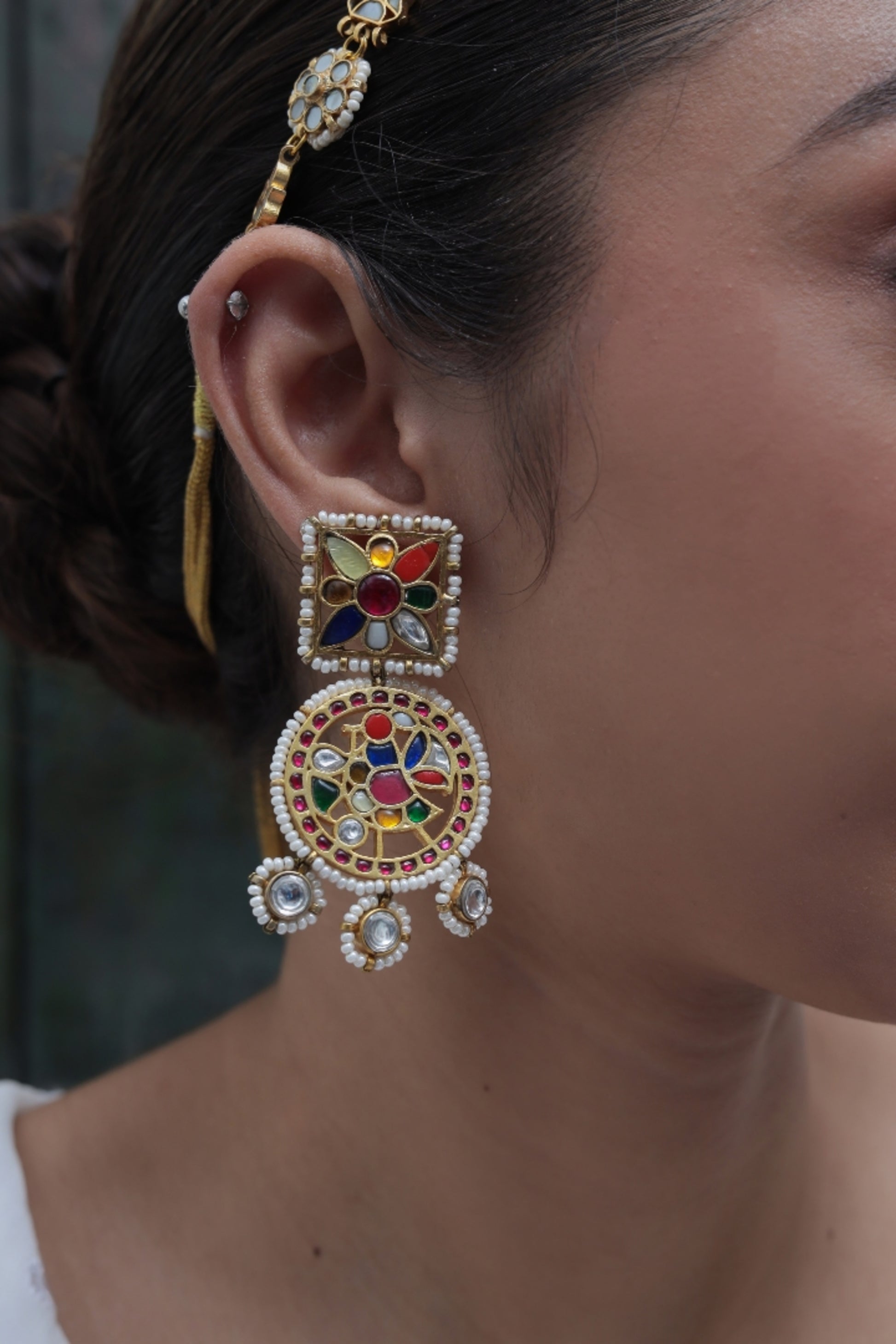 These exquisite Jadau Earrings are a tribute to timeless elegance, crafted with intricate floral detailing inspired by the grace of a blooming lotus. Plated in pure gold, each piece reflects regal charm while offering modern durability. Designed to be anti-allergic and finished with an anti-tarnish coating, these earrings promise lasting brilliance without turning black. Adorned with delicate pearls and sparkling stones, they beautifully blend traditional artistry with contemporary sensibilities. Whether it's a wedding, festive celebration, or a touch of everyday luxury, this pair is the perfect companion to elevate your ensemble.